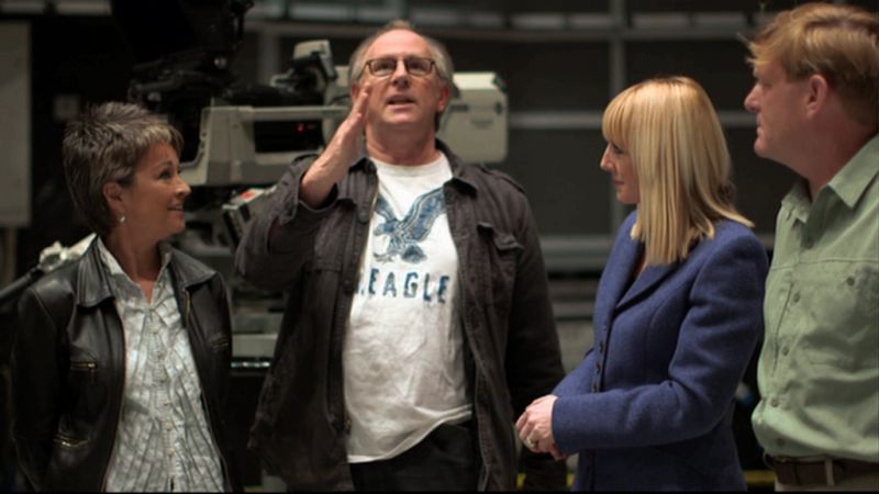 Yvette Fielding is back for the second half of The Television Centre of the Universe - and we also get a "previously" which is quite useful if you haven't watched the first half since it's release on The Visitation in 2013. The "cliff-hanger" is resolved to be cameraman Alec Wheal, and then it's straight into anecdotes between him and the trio of Peter Davison, Janet Fielding and Mark Strickson about life in the studio during recording (plus BBC producer/fan Richard Marson chatting about the "fan glitterati" who watched whatever they could studio galleries!). As before, the main conversations were interspersed with anecdotes from other production personnel, such as assistant floor manager Sue Hedden on how props could disappear and exhibitions assistant Bob Richardson admitting he had purloined a terileptil mind control device! Other contributors included production assistant Jane Ashford (who reflected on the challenges of maintaining contunuity during filming) and videotape engineer Simon Anthony (who commented on combatting recording issues from lighting and physical effects). It was also an unexpected bonus to see behind-the-scenes footage from Earthshock to help illustrate the discussion!